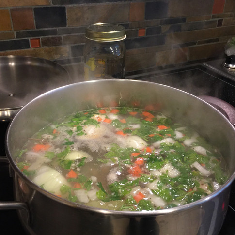 DIRECTIONS In large soup pot melt butter and oil, add onions, carrots, celery, bay leaves, thyme, garlic. Cook until onions are translucent, about 5 minutes. Add chicken legs, ginger, cook for 5 minutes, add chicken bouillon and chicken broth, bring to a boil and reduce to medium low for 45 minutes. Add lemon juice and parsley. Taste and adjust seasoning. Cook for 5 minutes more. Et Voila!